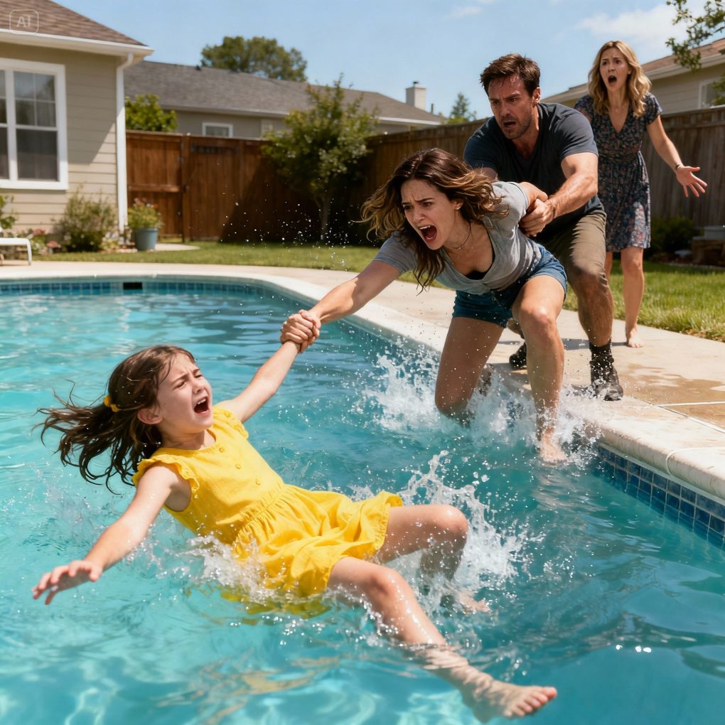 The shrill laughter of my sister echoed across the backyard, bouncing off the walls like a cruel symphony. “Go on, Lily! You can do it!” she taunted. But this wasn’t encouragement—it was a trap. I froze as my six-year-old daughter, soaked and trembling, was shoved into the deep end of the pool, still wearing her Sunday dress. Panic ripped through me, every instinct screaming to save her, but before I could move, my father’s hands clamped around my neck, pinning me to the ground.
