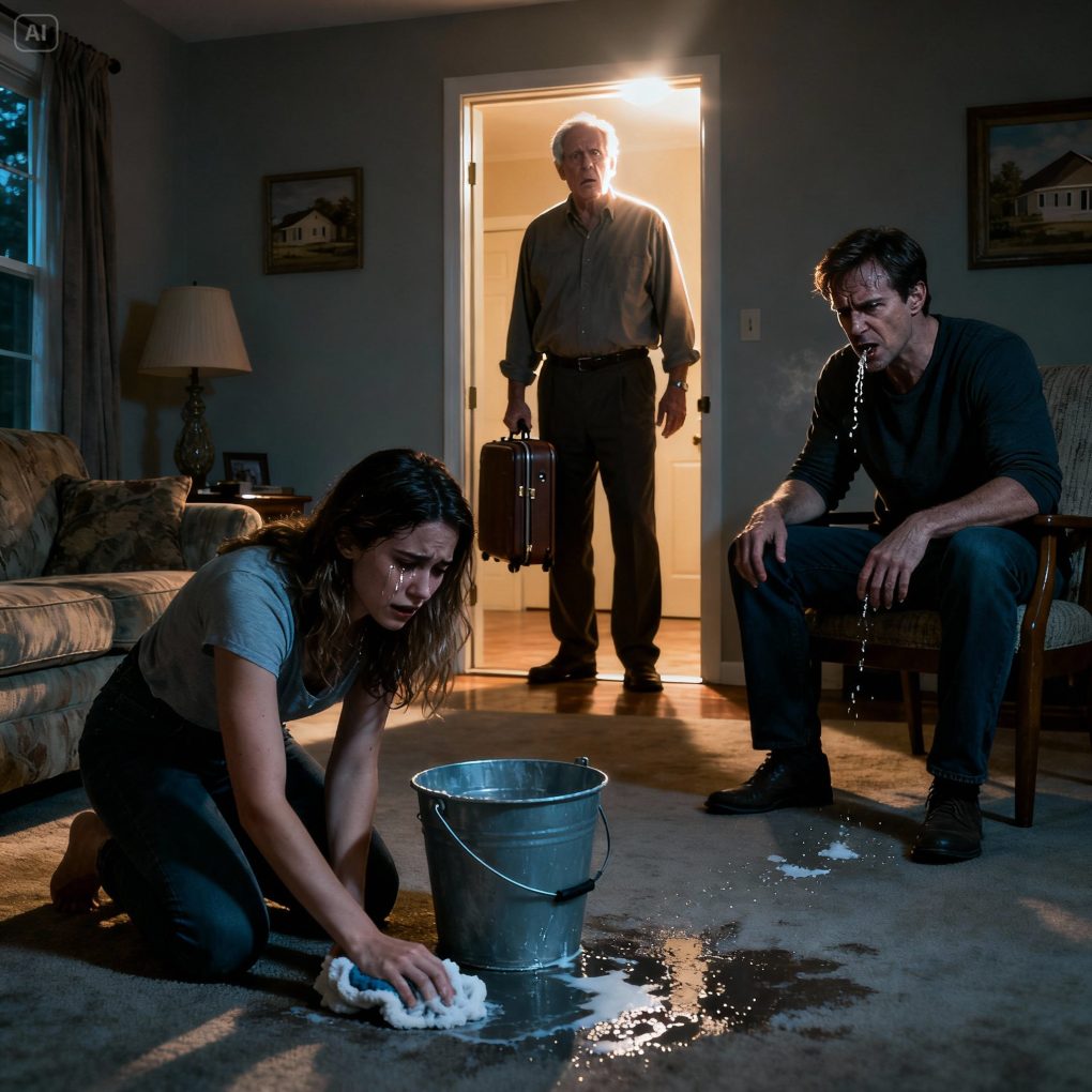 When Daniel Carter stepped onto the cracked driveway of the old family home after fifteen years abroad, he carried only a suitcase and a fragile hope of seeing his daughter, Emma, smiling again. Instead, as soon as he walked through the half-open front door, the sound that greeted him was a harsh, mocking laugh. Emma was on her knees scrubbing the living-room floor with a bucket beside her. Her husband, Lucas Grant, stood over her with a beer in his hand. When Emma finished wiping a spot clean, Lucas deliberately spat on it and smirked. “Missed a spot, you useless thing,” he said, nudging her shoulder with his foot.
