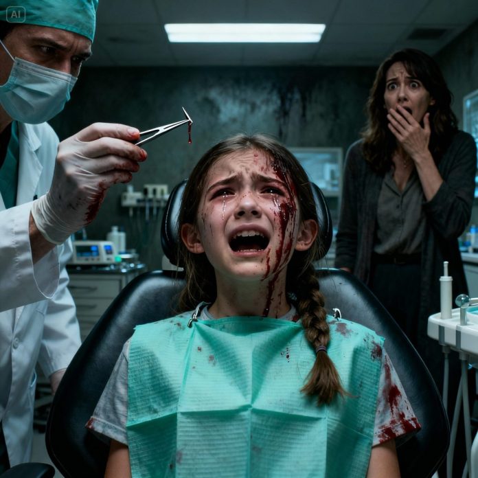 My 12-year-old daughter kept crying from jaw pain, barely able to eat anything, but my ex-husband insisted, “She’s just losing her baby teeth.” The moment he left the house, I rushed her to the dentist. Right after the dentist examined her, he turned off the lights and quietly locked the door. “Stay calm,” he whispered, his hands trembling as he pulled out a tiny, razor-sharp object from my daughter’s swollen gum. My blood ran cold. I grabbed my phone and called the police.