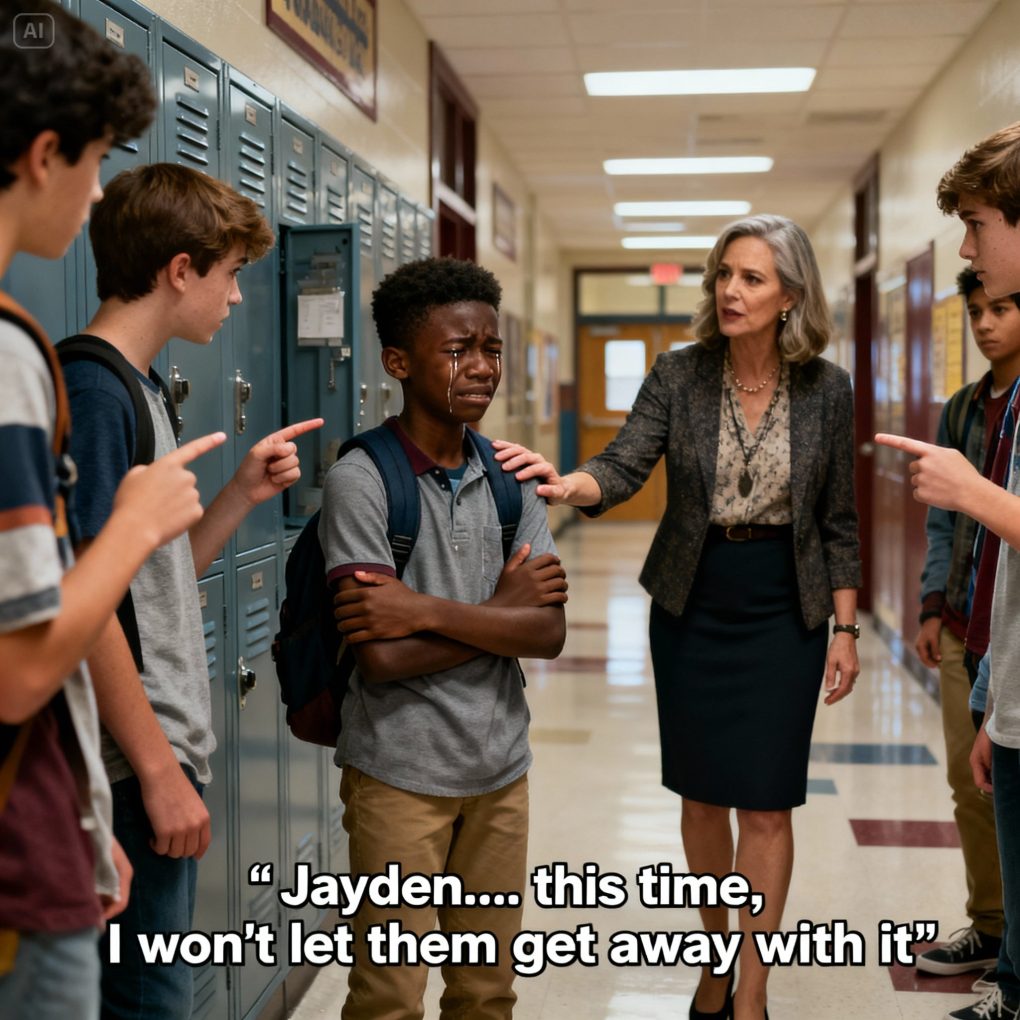 The hallway echoed with laughter—the cold, sharp kind that slices deeper than any slap. Jayden was walking toward his locker, shoulders slightly hunched the way he always carried them when he hoped to go unnoticed. But today, like so many days before, he didn’t get lucky.