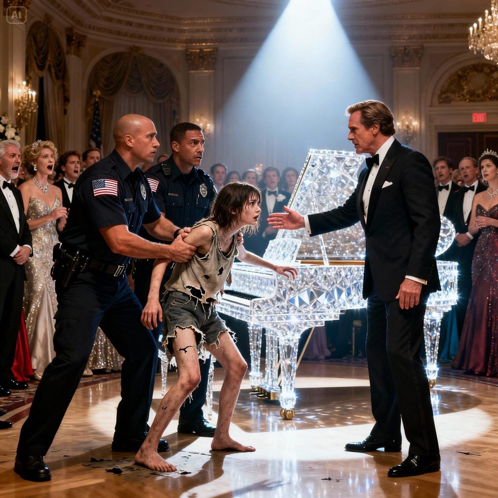 The gala at the Harrington Hall was meant to be a celebration of elegance—crystal chandeliers, flowing gowns, champagne glasses clinking like delicate bells. But the room froze when two security guards dragged in a trembling, dirt-streaked girl who looked no older than fifteen. Her hair was tangled, her clothes thin and patched. Yet her eyes—sharp, focused—were fixed not on the judgmental crowd, but on the grand Steinway piano at the center of the stage.