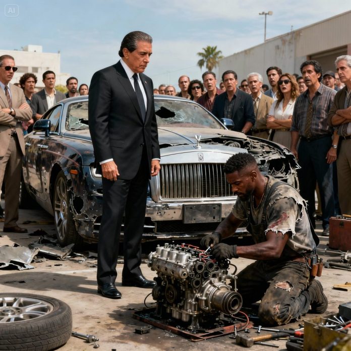 Samuel se acercó con cautela al Ferrari. Escuchó el sonido débil del motor, revisó el cableado visible y pidió permiso para abrir el capó. Leandro, todavía divertido, se lo concedió.