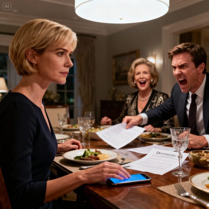 During family dinner, my husband slammed divorce papers onto the table. “Sign them. I’m done looking at your pathetic, low-class face.” His mother chuckled cruelly. “My son’s a director. He deserves someone far above you.” I smiled softly and lifted my phone. “Go on.” Then I fixed my gaze on him. “You do realize… your director title only exists because I approved it?” He went rigid. “W-what do you mean…?” I placed my phone down with perfect calm. “I mean: you’re fired.”