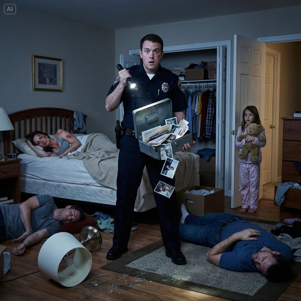 A 911 call came through, a six-year-old crying so hard her words broke apart: “My dad… and his friend… they’re hurting my mom again. Please come fast.” When the police arrived, they found the girl huddled beneath a table, gripping her teddy bear. She pointed toward the bedroom with trembling lips. “Mom is in there.” Inside, her mother lay still while two intoxicated men were collapsed on the floor. But what truly stunned the officers wasn’t that scene—it was the item hidden in the closet, the one that unraveled a long-buried secret this family had kept for years.