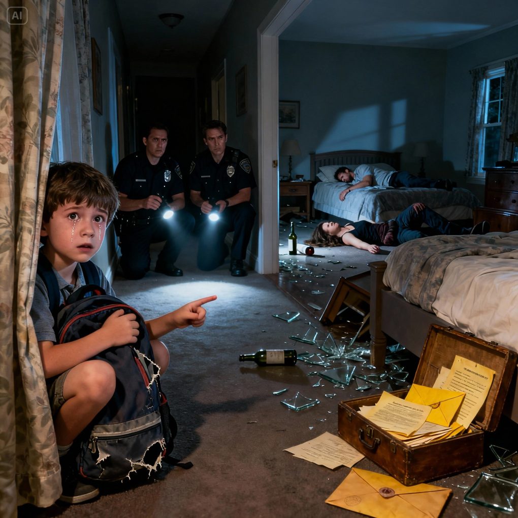 When Officers Daniel Brooks and Megan Carter reached the house, the front door hung crooked on its hinges as if someone had recently slammed against it. Inside, the air smelled of spilled alcohol and something metallic. A faint sob led them to the living room, where a seven-year-old boy crouched behind the curtains, hugging a torn blue backpack as if it were a shield.