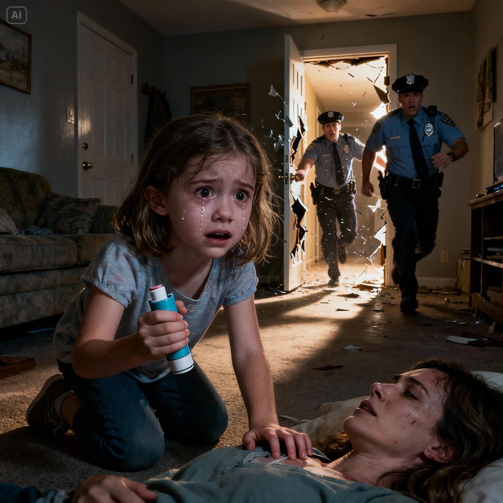 A six-year-old girl called 911 and whispered, “My hand… it won’t work anymore. It hurts so bad, but I can’t stop.” When officers forced the door open, her mother was lying unconscious on the floor. Kneeling beside her, the girl was shaking, her small fingers wrapped tightly around the asthma inhaler she had been pressing over and over—desperately trying to save the only person she had in her world.