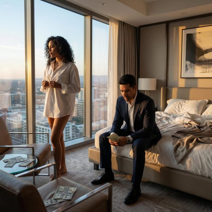 Pasó la noche en la suite del millonario, no como un intercambio de afectos, sino como un contrato tácito lleno de silencios pesados. No hubo nada que ella no pudiera soportar, pero sí hubo algo que marcó su alma: la sensación de haber cruzado un límite que jamás imaginó.