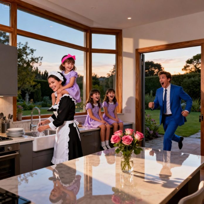 He stepped inside and froze. The marble floors, usually spotless, were strewn with toys, crayons, and spilled juice. In the middle of the chaos knelt Maria, the maid, carefully bandaging a scraped knee on one of his triplets while the other two clung to her, laughing nervously despite the minor injuries.