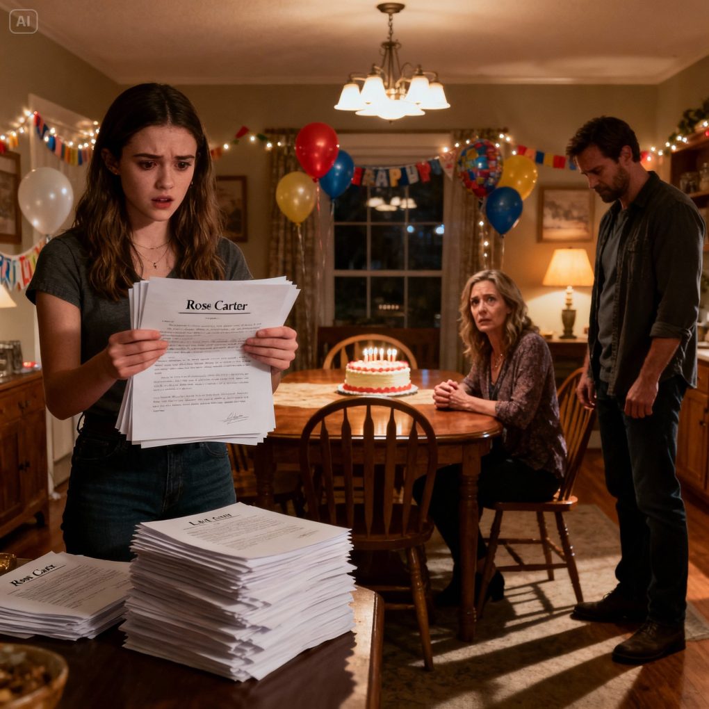 When Rose Carter returned home for her mother’s birthday, she expected awkward hugs and forced small talk—nothing more. But the moment she stepped inside, the room went silent. Her father wouldn’t meet her eyes. Her mother kept wringing her hands. And on the dining table sat a thick stack of legal papers with her name on every page.