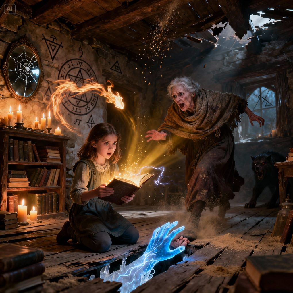 The candles flickered violently as if something invisible had entered the room. “Grandma… what’s happening?” Lily whispered, clutching the old spellbook she wasn’t supposed to touch. Her grandmother’s face drained of color. “Lily… what did you read?” “I—I just said the first line out loud.” A low, guttural growl echoed from the shadows. The walls trembled. The mirror cracked. Grandma shouted, “Don’t move! You just awakened the one spirit our family spent centuries trying to bury!” And Lily felt a cold hand wrap around her ankle.
