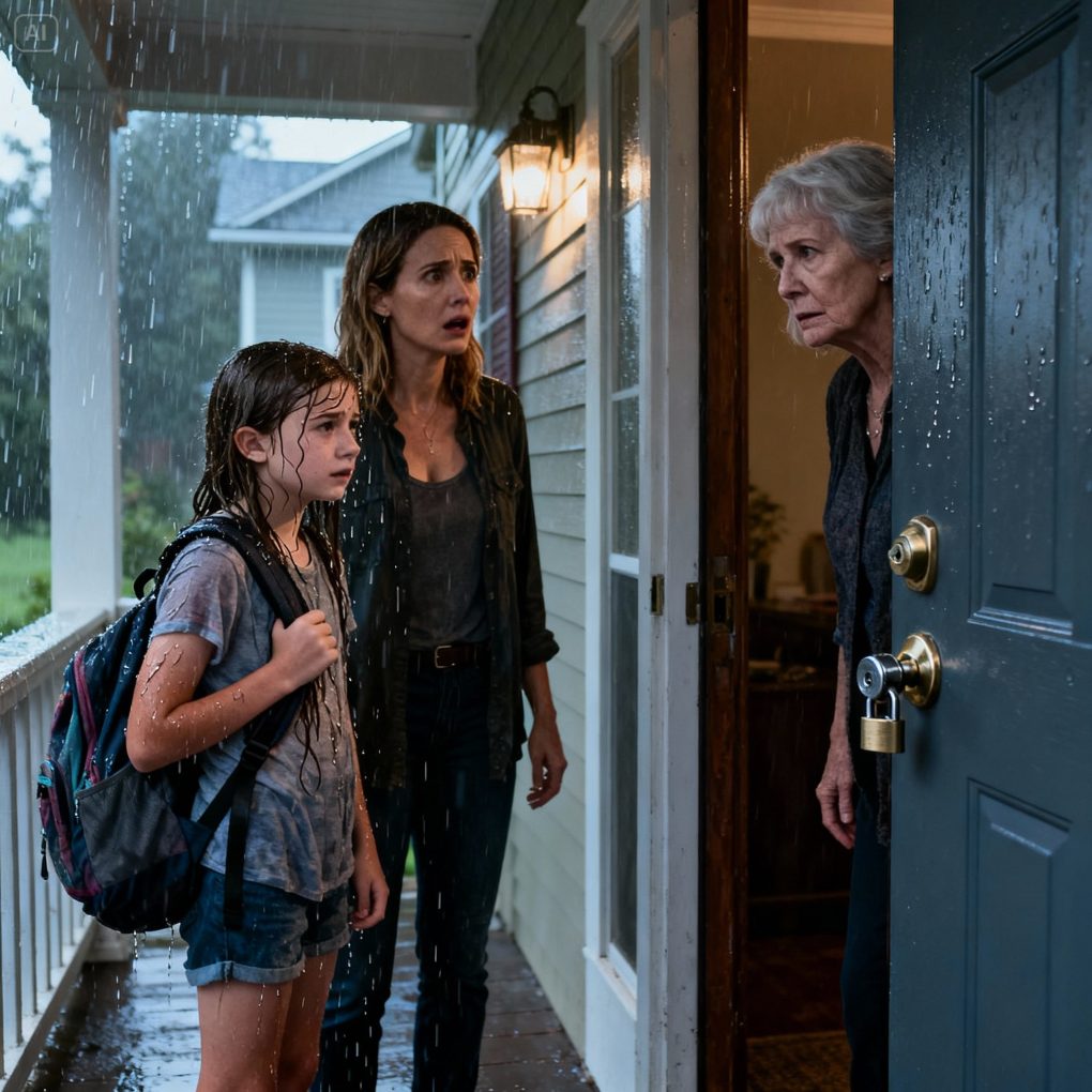 Rain hammered against the front porch as Emily Carter, eleven years old and trembling, stood at the doorway. Her jacket was soaked through, her braids dripping onto the welcome mat that suddenly felt like it didn’t welcome her at all. She clutched her backpack straps tightly, her voice thin and shaky.