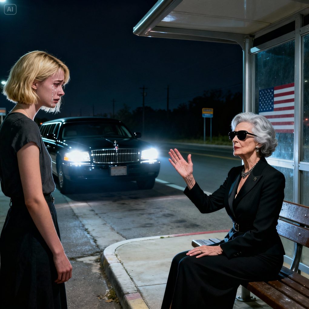After our fight, my husband threw me out and abandoned me at a lonely bus stop far outside the city, without a single dollar. I was nearly broken, ready to walk over twenty-five kilometers home. Then an elderly blind woman lying on the bench whispered, “Pretend to be my granddaughter. My driver will be here soon.” I froze. She smiled softly, her voice shaky yet proud: “And let’s see how your husband regrets abandoning his wife next to the richest woman in the city.” A few minutes later, a limo pulled up—and from that moment, my entire life took a different turn.