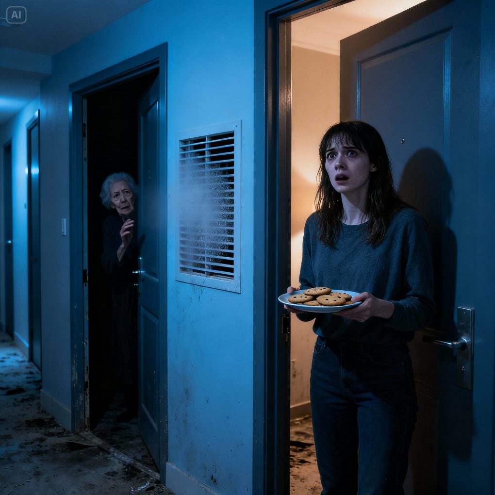 When she opened it, an elderly woman—thin, gray-haired, warm smile—stood in the hallway holding a plate of cookies wrapped in plastic.