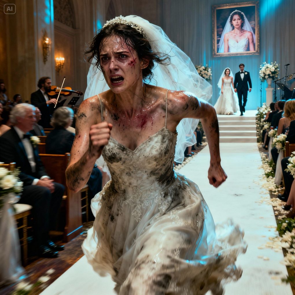 A woman stumbled inside—pale, bruised, wearing a torn wedding gown streaked with grime.