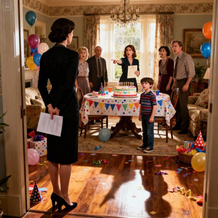 I walked into my nephew’s first birthday party still numb from my husband Mark’s funeral. I just wanted an hour where nobody whispered condolences or looked at me with pity. The room was bright—streamers, balloons, kids laughing—but the moment I stepped inside, everything fell silent. And then my sister, Emma, stood up.