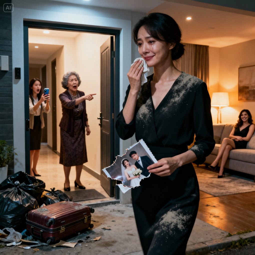 They dragged her suitcases to the doorstep like she was trash—his mother shouting, his sister filming, and the mistress smirking from the sofa as if she’d already won. All because she was “useless,” “broke,” and “easy to replace.” She didn’t scream. She didn’t beg. She simply picked up her torn wedding photo, wiped the dust off her hands, and walked away with nothing but a quiet smile. What they didn’t know was that five hours earlier, a lawyer had called her with news that would rewrite their lives forever.