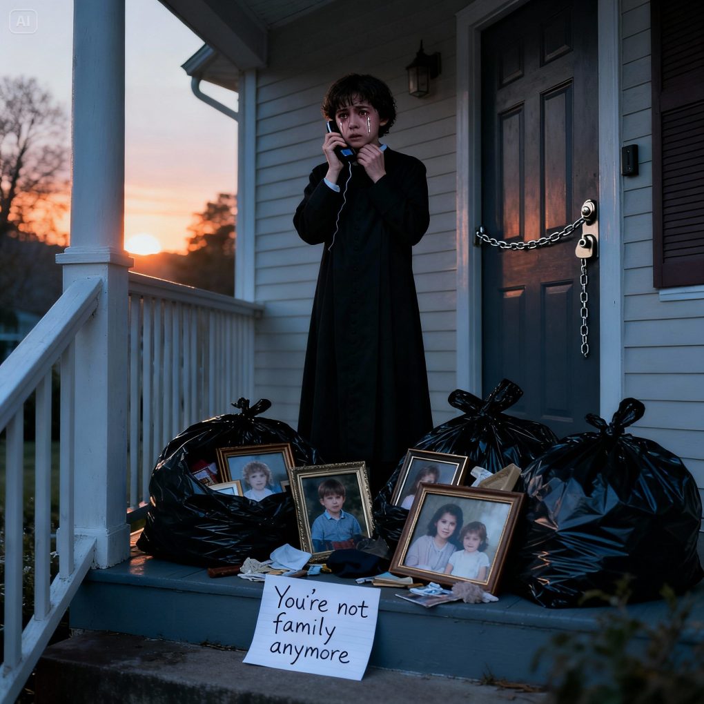 The day my father died, my stepmother stood at the funeral and cried like she’d lost the love of her life. That night, she changed the locks. By morning, my childhood photos were in trash bags on the porch—along with a note: “You’re not family anymore.” I was numb… until my dad’s lawyer called and said, “Where have you been? Your father left you everything.” The silence on the other end of the line wasn’t my lawyer. It was someone listening—and then the call dropped.