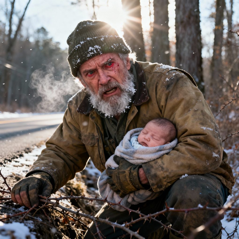 On a bitter-cold November morning, I drove slow along the gravel fire road, scanning the treeline like I’d done for forty years. Then a soft, rhythmic cry tore through the silence—not a deer, not a man. I jumped into the ditch, shoved aside the briars… and froze: an infant carrier, hidden like trash. “Oh God… who leaves a baby here?!” I wrapped the blanket tighter and whispered, “Easy. I’ve got you. You’re safe now.” And in that instant, I knew I wasn’t hunting today—I was fighting for a life… and the truth behind that cry was only beginning.