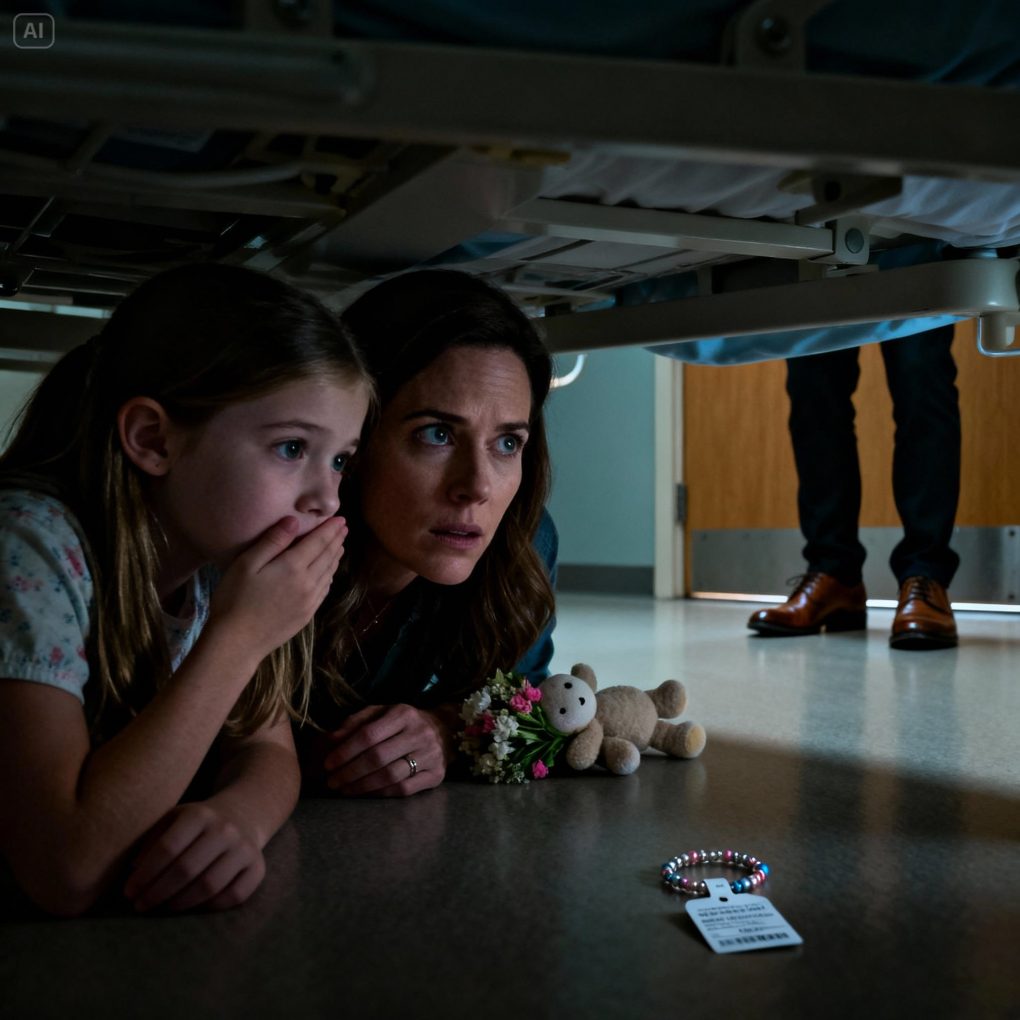 I didn’t have time to argue. Panic made me lighter than I should’ve been. I slid off the bed, biting back a noise, and followed my daughter down. The space beneath the hospital bed was narrow and smelled like disinfectant and dust. Sophie pressed herself close, guiding me into the darkest corner.