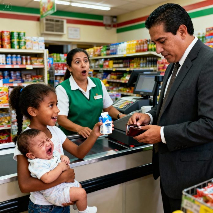 —Señor… por favor… necesito esta leche para mi hermanito. Se la prometo… se la pagaré cuando sea mayor —susurró con una voz quebrada que contrastaba con los gritos del pequeño.