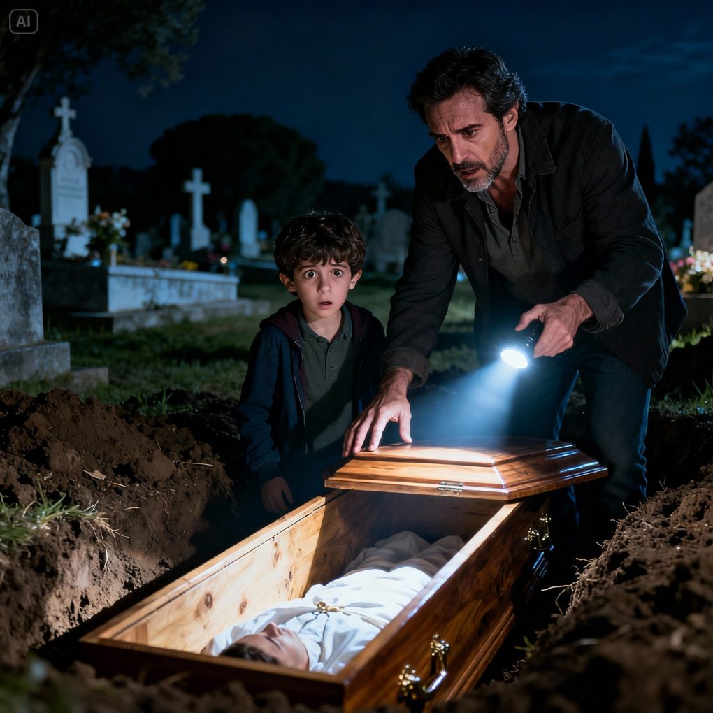 Javier sintió que el pánico estallaba. No solo había profanado una tumba: había llevado a su hijo consigo en esa locura. Intentó explicar, pero las palabras le salían torpes, incoherentes. Tomás lloraba, abrazado al ataúd.