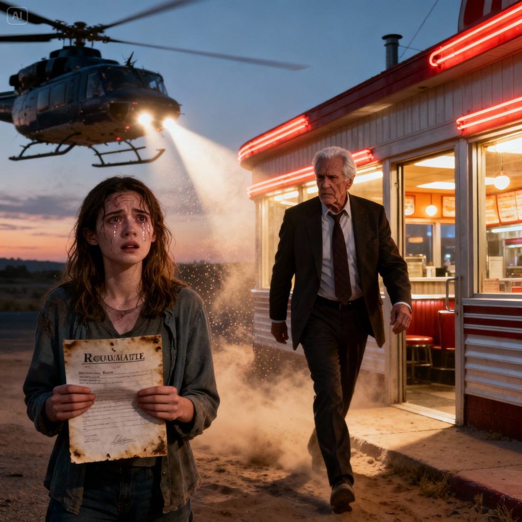 Wind whipped dust into my face, customers scrambled back inside, and the cook ran out with a spatula like he could defend us with it. I stood up slowly, shielding my eyes as the helicopter settled.