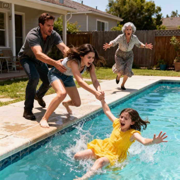 The moment Emily slipped beneath the pool’s surface, still wearing her pale-yellow dress, the world around me collapsed into a blur of noise and terror. She couldn’t swim—everyone in the family knew that. Yet my sister, Claire, pushed her anyway, laughing as if it were some childish prank. I was already sprinting toward the water when my father’s hand shot out like a steel trap. His fingers closed around the back of my neck and forced me downward.