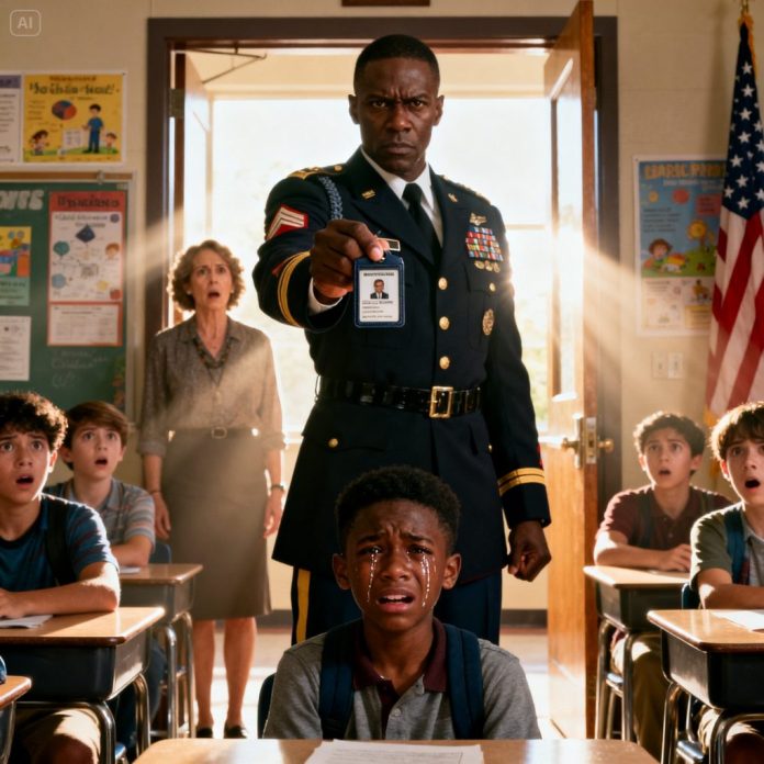 A tall figure stepped inside—a man in a sharply pressed uniform, medals aligned perfectly on his chest, a Department of Defense ID badge gleaming under fluorescent lights. His posture was rigid, his expression carved from authority. Students froze. Ms. Carter swallowed hard.