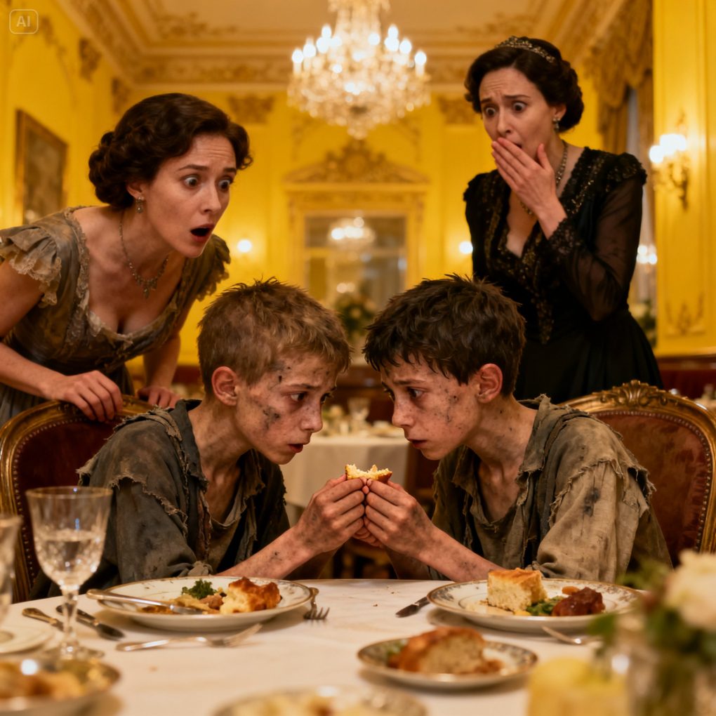 Two little boys—scruffy, thin, no older than six—stood beside her table. Their clothes were worn, their hair tangled. They looked painfully out of place among velvet chairs and polished marble floors.