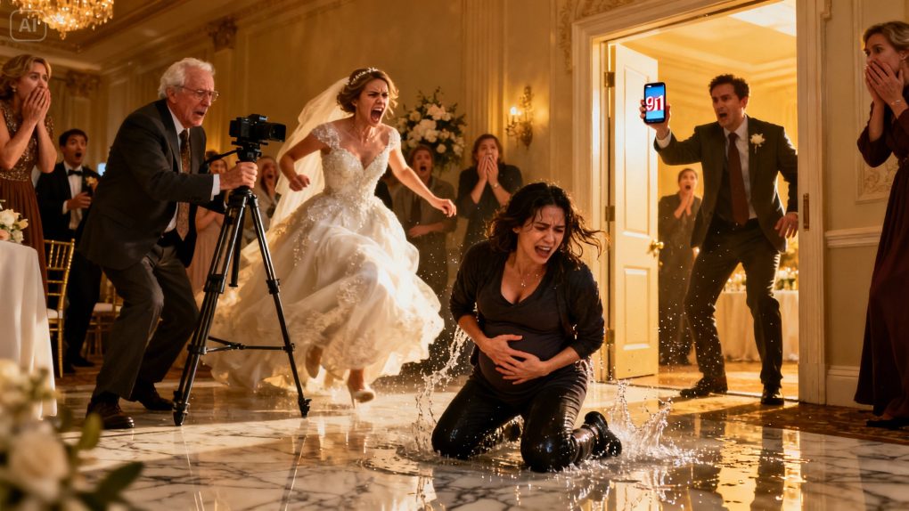 I stumbled backward, lost my balance, and crashed onto the polished floor. A sharp pain shot through my abdomen. And then — a warm rush spread beneath me. My dress darkened. Gasps erupted from every corner of the room.