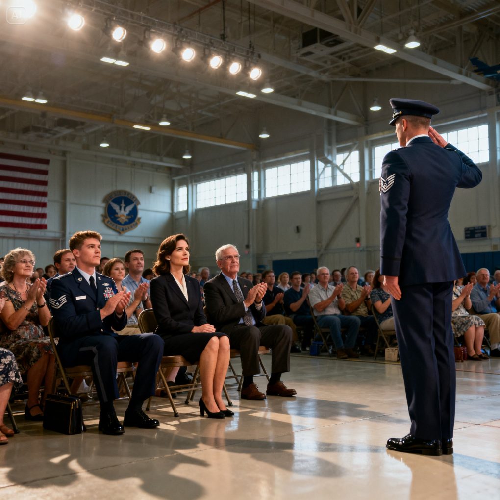 The auditorium was packed. Flags lined the stage. Families whispered with pride. My mother dabbed her eyes. My father leaned back confidently, already telling the people next to him how his son was finally doing something meaningful.