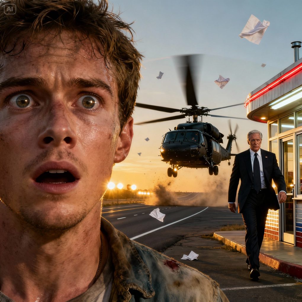 I stepped outside into the dry heat, the highway stretching endlessly in both directions. That was when the noise came—deep, violent, impossible to ignore. At first, I thought it was a truck. Then the air began to vibrate. A helicopter descended behind the diner, whipping dust, paper, and regret into a storm.