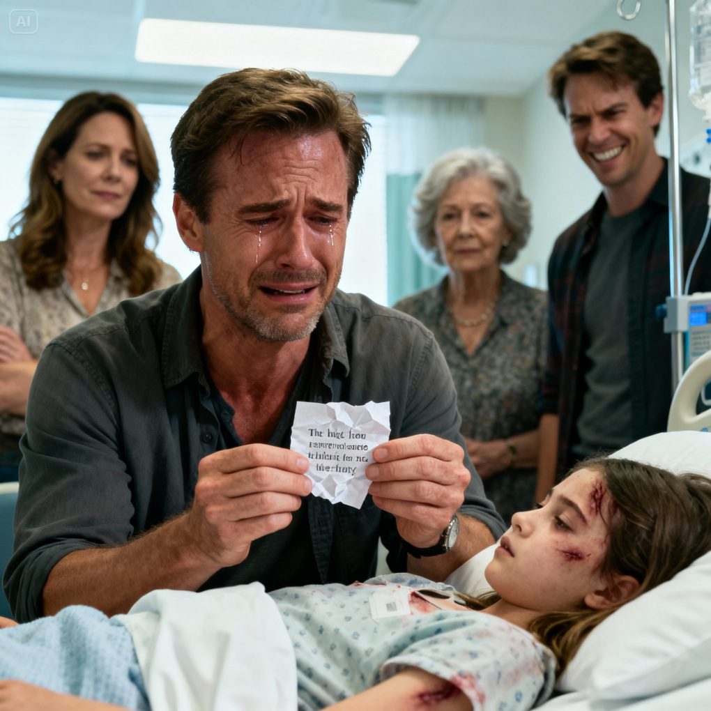 I sat by my daughter’s hospital bed, holding her hand tightly as the doctor said, “The fall was severe. She might not wake up.” My wife burst into tears, and my mother-in-law whispered, “Maybe it’s for the best… she was always too difficult to handle.” My brother added, “Some kids just cause trouble to get attention.” Then I noticed a crumpled piece of paper in my daughter’s hand. On it were the words: “Dad, if anything happens to me, check the camera I set up in my room.” I drove home immediately, watched the footage — and called the police without hesitation