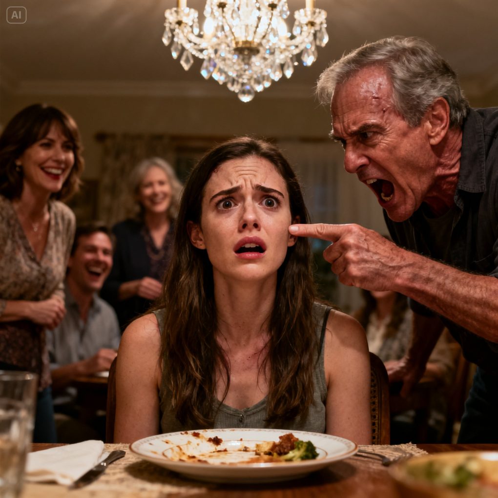 My father slammed his glass on the table so hard the room went silent. Wine splashed onto the tablecloth. Every face turned toward us.