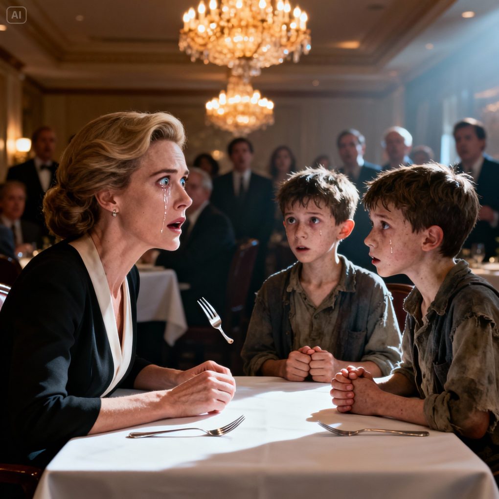 En medio del lujoso restaurante, dos gemelos desaliñados se acercaron a la mesa de la mujer adinerada. Uno de ellos preguntó tímidamente: «Señora… ¿podríamos servirnos algo de comida sobrante, por favor?». Ella levantó la vista y casi se le para el corazón. Esos ojos, esa nariz… idénticos a los dos hijos que llevaba años buscando. Su voz temblaba al susurrar: «¿Quiénes son ustedes? ¿Por qué se parecen tanto a su madre?». Los gemelos se miraron, y su respuesta empezó a desentrañar un secreto devastador.