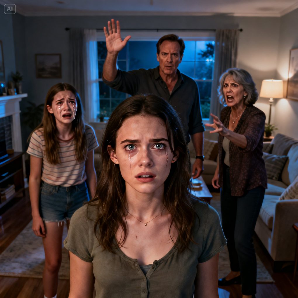 I stood there, stunned, as my sister sobbed, “Look what she did!” and Mom’s fury crashed down on me. I opened my mouth to defend myself—but Dad raised his hand and asked one quiet question. The room froze. My sister’s face drained of color, her eyes flickering with panic. That was the moment I realized the truth was about to explode… and nothing in our family would ever be the same again.