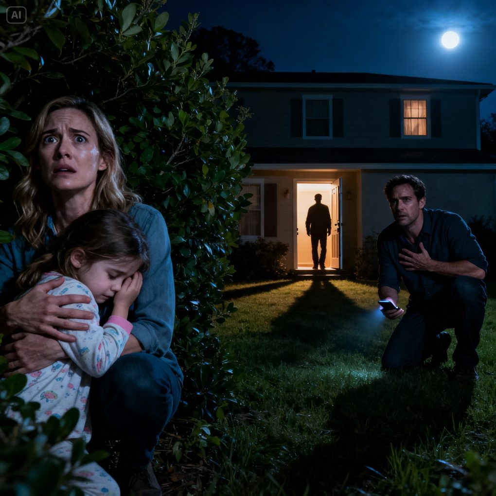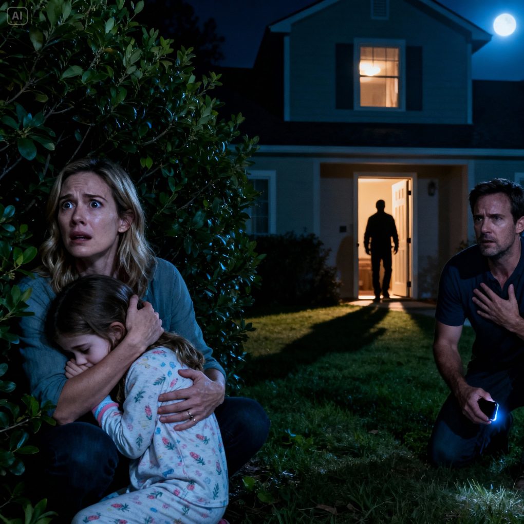 My husband shook us awake in the middle of the night, eyes frantic. “Get up—backyard. NOW!” “What’s happening?” I gasped. Our 5-year-old clung to me, sobbing, “Mommy, I’m scared…” “No time to explain,” he snapped, already dragging us toward the door. Still in pajamas, I scooped up our daughter and we ran into the freezing dark, hiding in the bushes like prey. Then we watched the house… And when I saw who stepped out, my blood ran cold. I started trembling—pure terror.