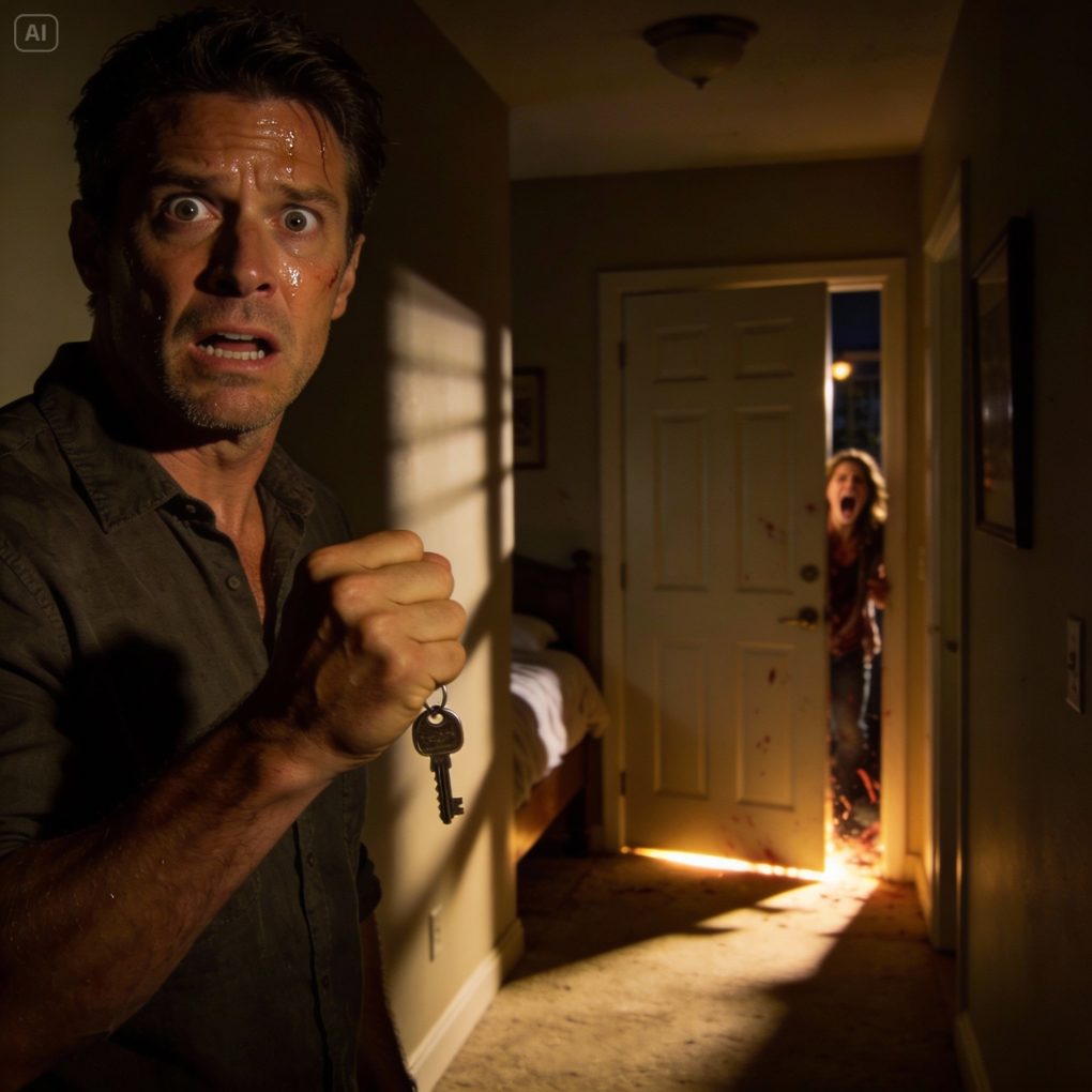 He pressed the key into my hand and whispered, “Don’t go to your room.” I laughed it off—until five minutes later. A scream tore through the house. Not one. Several. I froze outside the door, my heart pounding, knowing I was about to see something I could never unsee. Whatever was happening in that room wasn’t an accident. And the key in my hand meant one thing: I had been warned… too late.