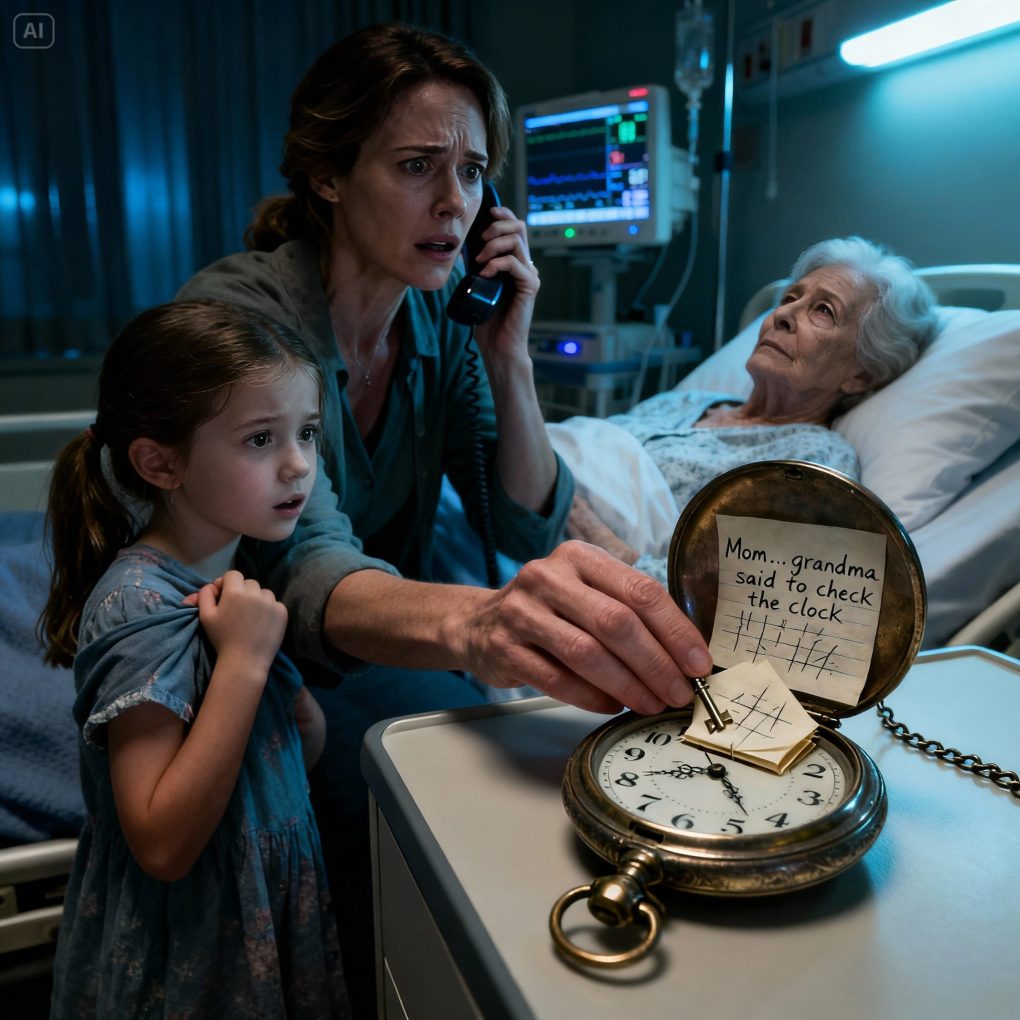 My grandmother was hospitalized because of her age, so we went to visit her. While the adults chatted, my 8-year-old daughter tugged my sleeve and whispered, “Mom… grandma said to check the clock.”I glanced at the pocket watch sitting on the bedside table and picked it up, confused. The metal felt cold in my palm. I flipped it open——and in that instant, my stomach dropped.My hands started shaking as I snapped it shut, backed away from the bed, and grabbed my phone. I didn’t even think. I just called the police.