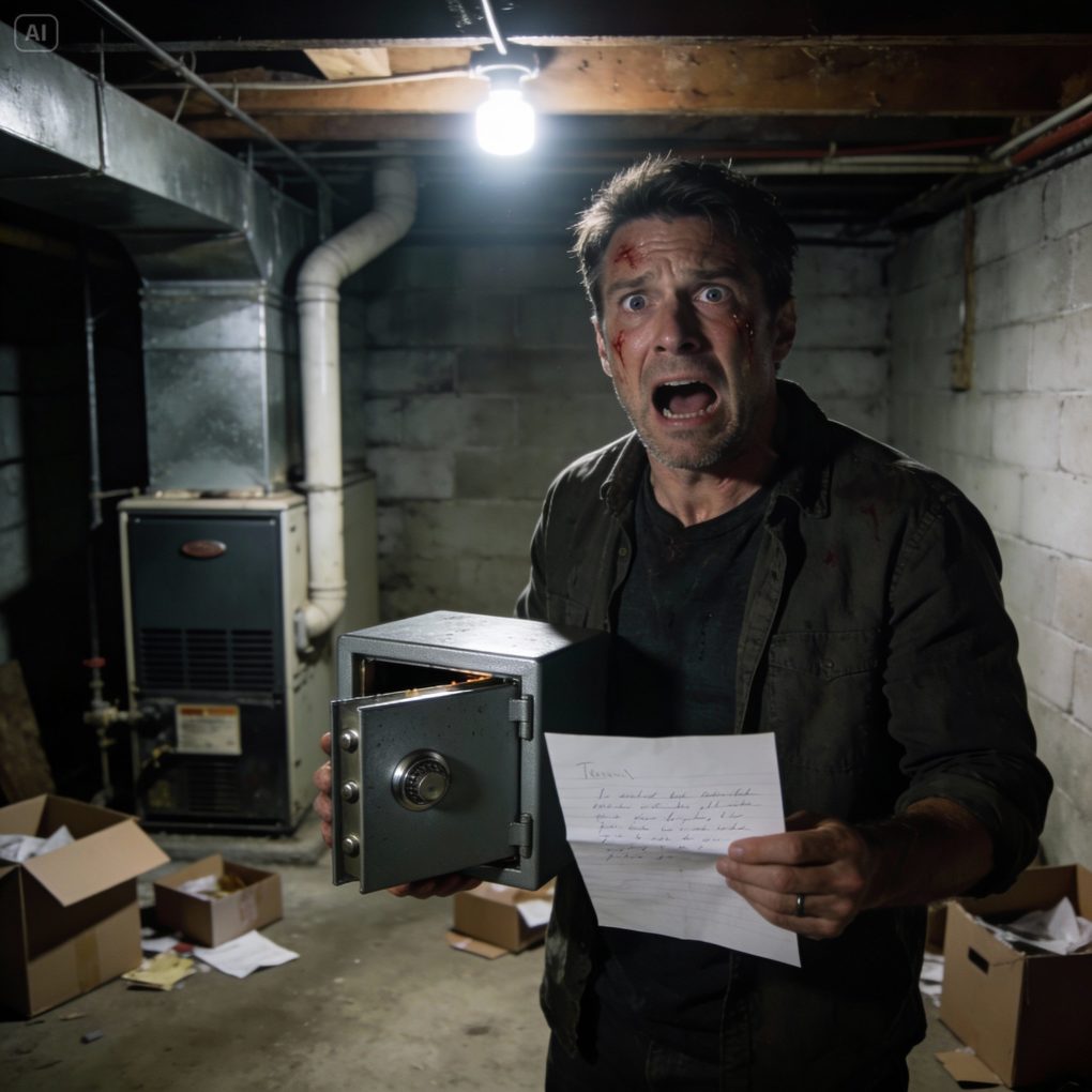 While cleaning, I noticed something odd behind the furnace: a section of wall that didn’t match the rest. I pushed aside a stack of old boxes and found a metal safe bolted into the concrete. It was old, scratched, deliberate.