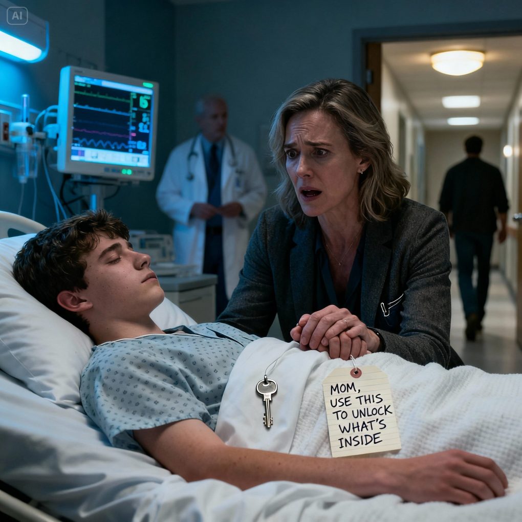 I entered my son’s hospital room after his accident put him in a coma. The doctor said, “there’s little chance he’ll wake up.” My husband left without a word, leaving me alone at his bedside. When I reached to hold his hand, a small key fell from his pocket. Attached was a note with shaky handwriting: “mom, use this to unlock what’s inside.”