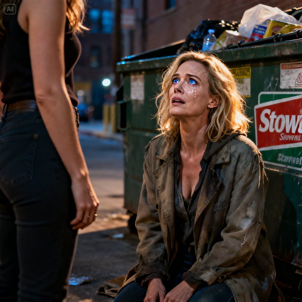 I looked up, expecting disgust or indifference. Instead, I saw a woman in her late fifties, well-dressed but understated, her eyes sharp and searching rather than pitying. She studied my face as if matching it to a memory.