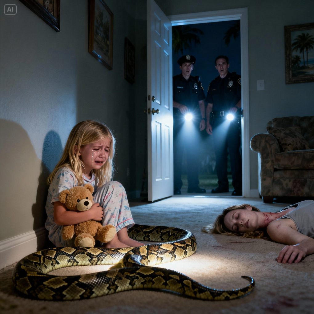 What they saw next would haunt even the most seasoned detectives. In the middle of the floor lay a massive reticulated python, nearly 12 feet long, coiled near the motionless body of a woman. Emily was crouched in the corner, clutching a torn teddy bear, her pajamas soaked in tears.