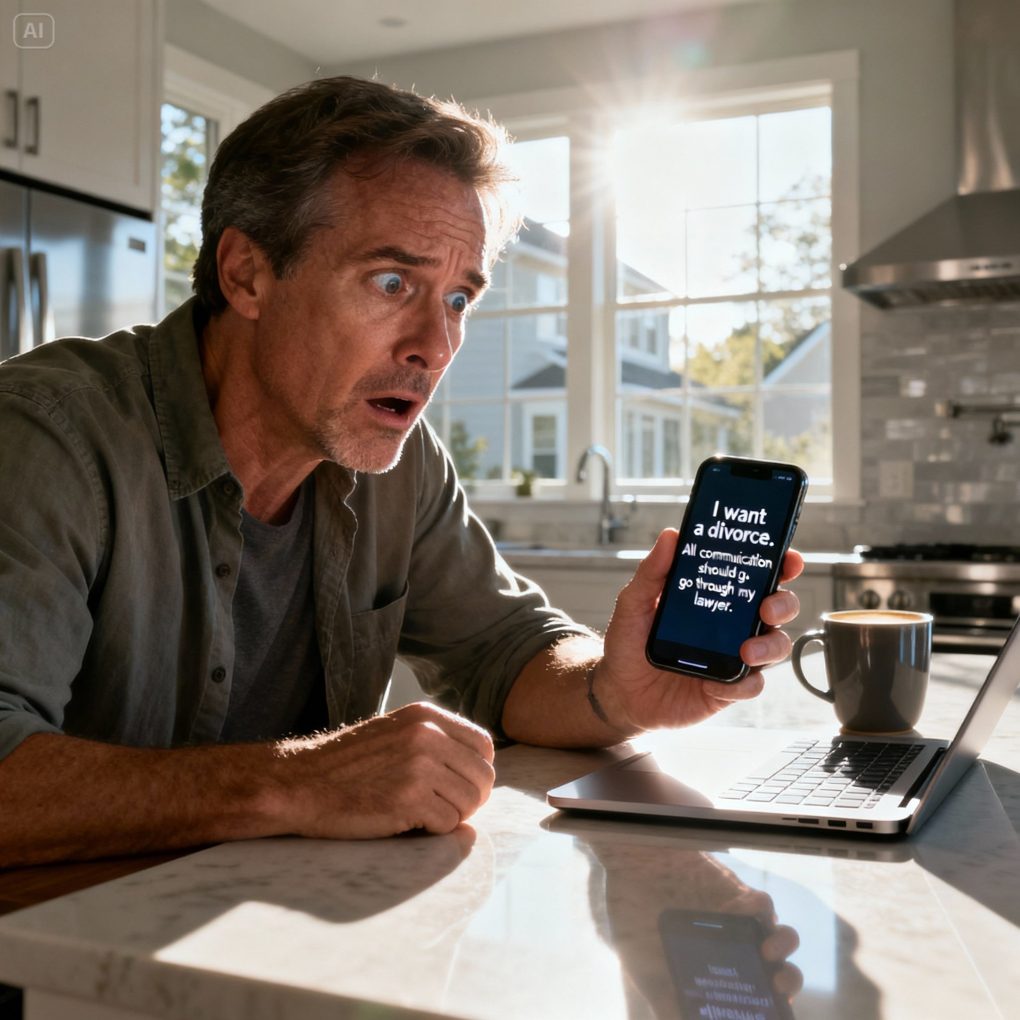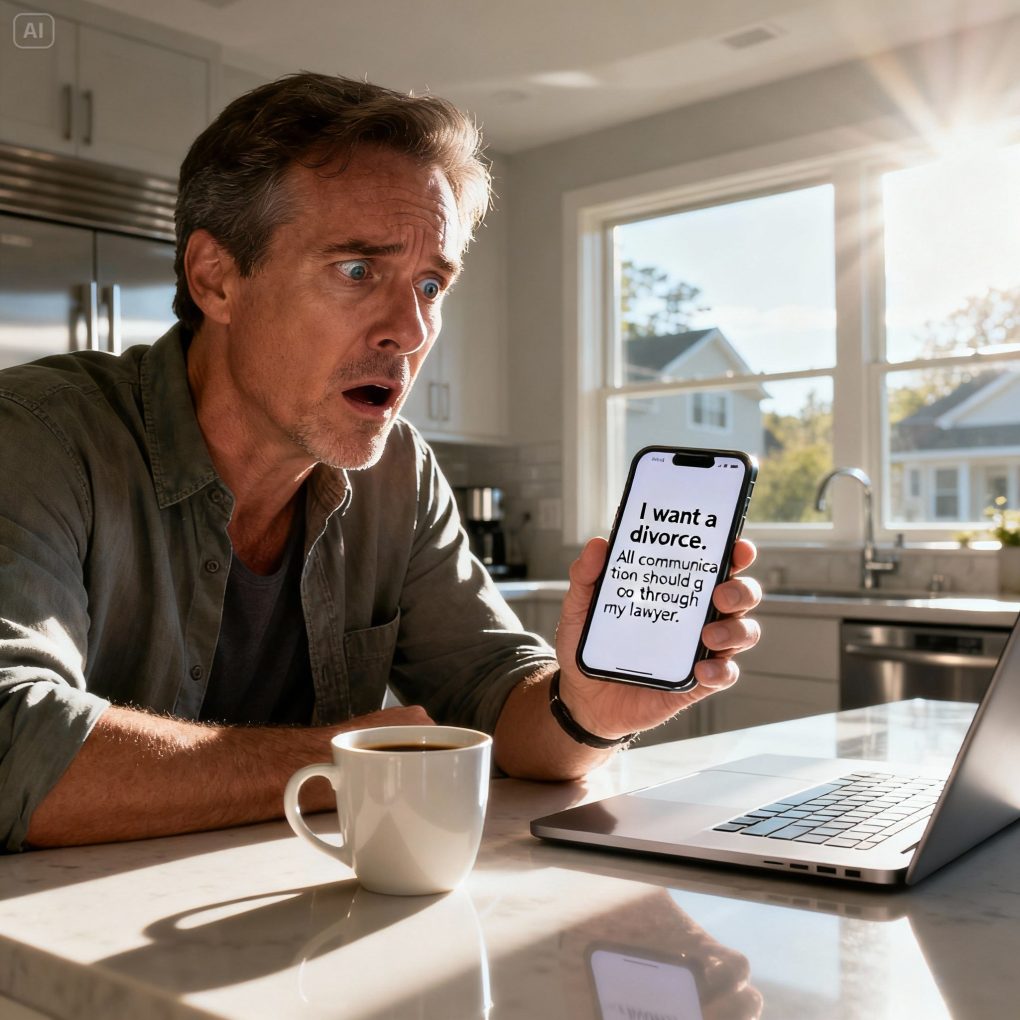 When the message popped up on Mark’s phone that Tuesday evening, it was just seven words: “I want a divorce. All communication should go through my lawyer.”