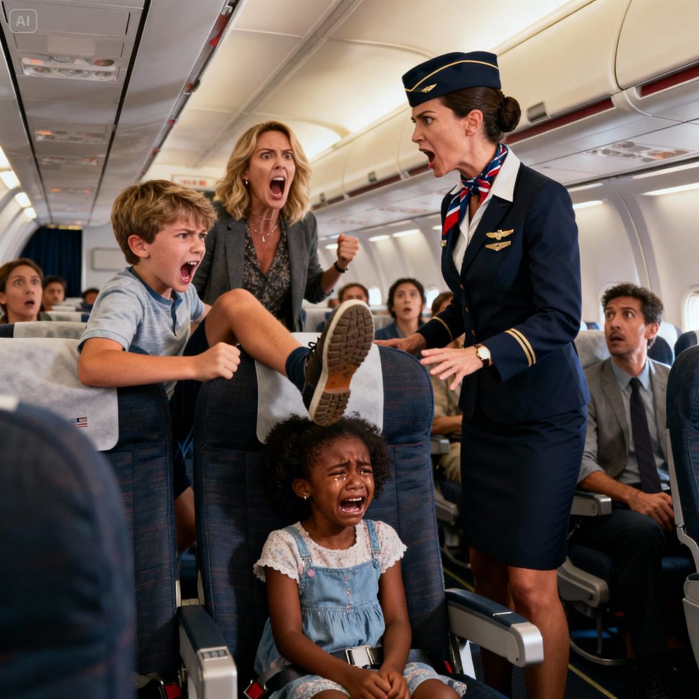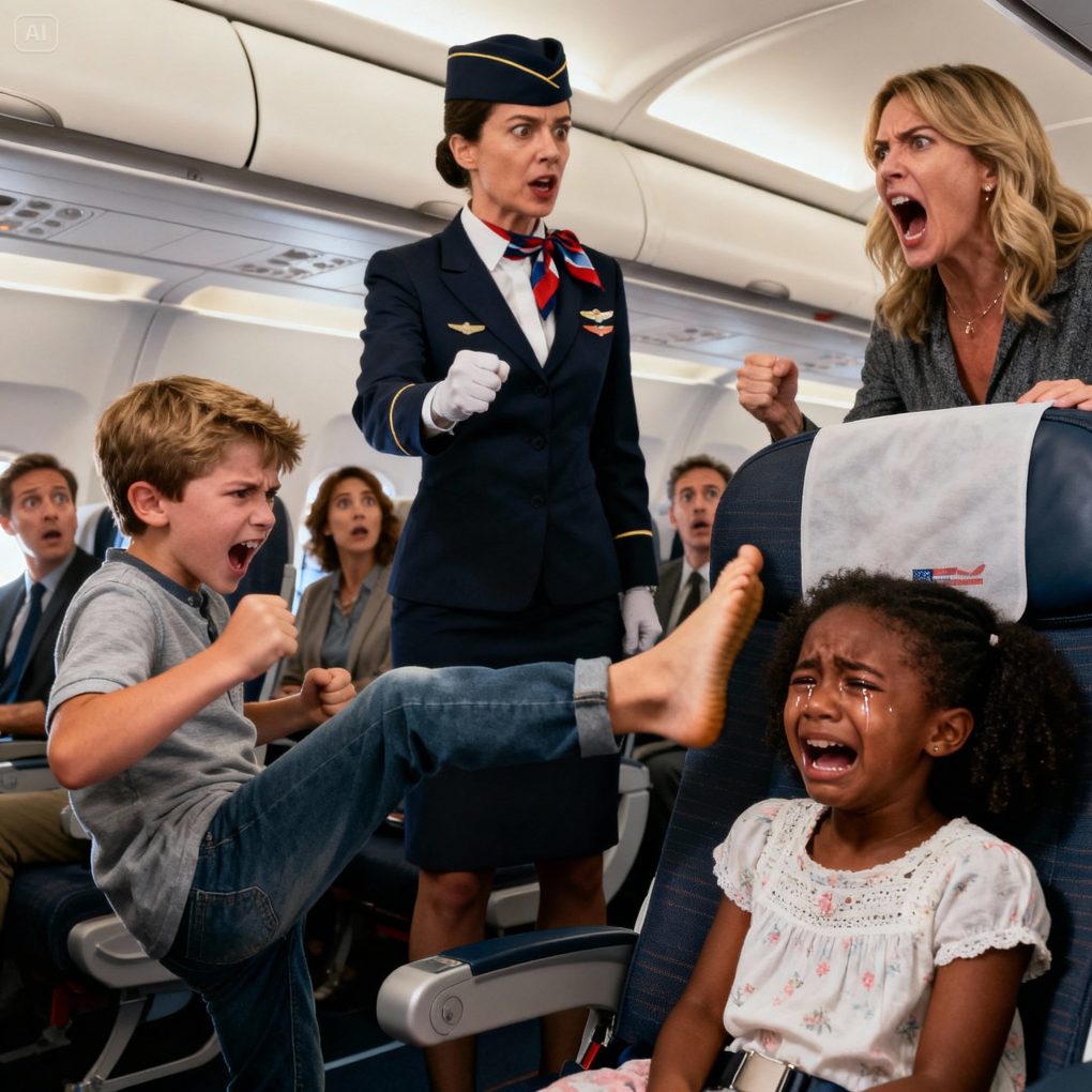 The boy kept kicking the black girl’s seat on the plane — the flight attendant warned him, but his mother started yelling racist insults… and the regretful ending…